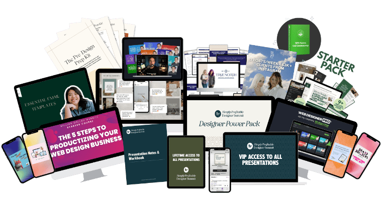 With the Designer Power Pack you get unlimited access to my session, Create a Signature Offer That Converts + Workbook, the live panel What Helps Websites Convert, my Q&A replay, plus 20+ expert presentations designed to help you build a more profitable creative business.
